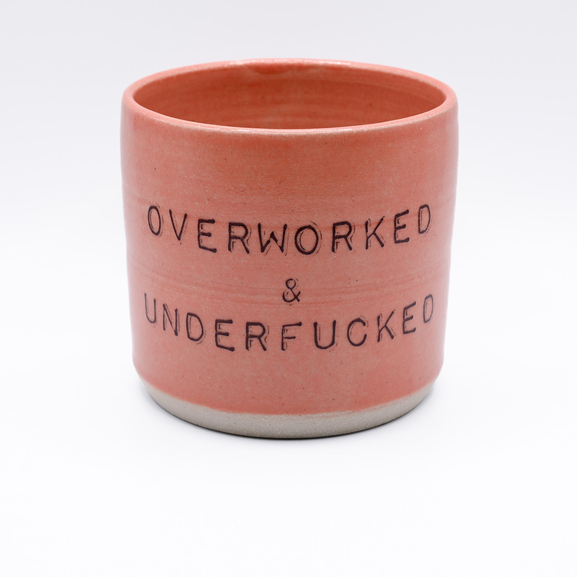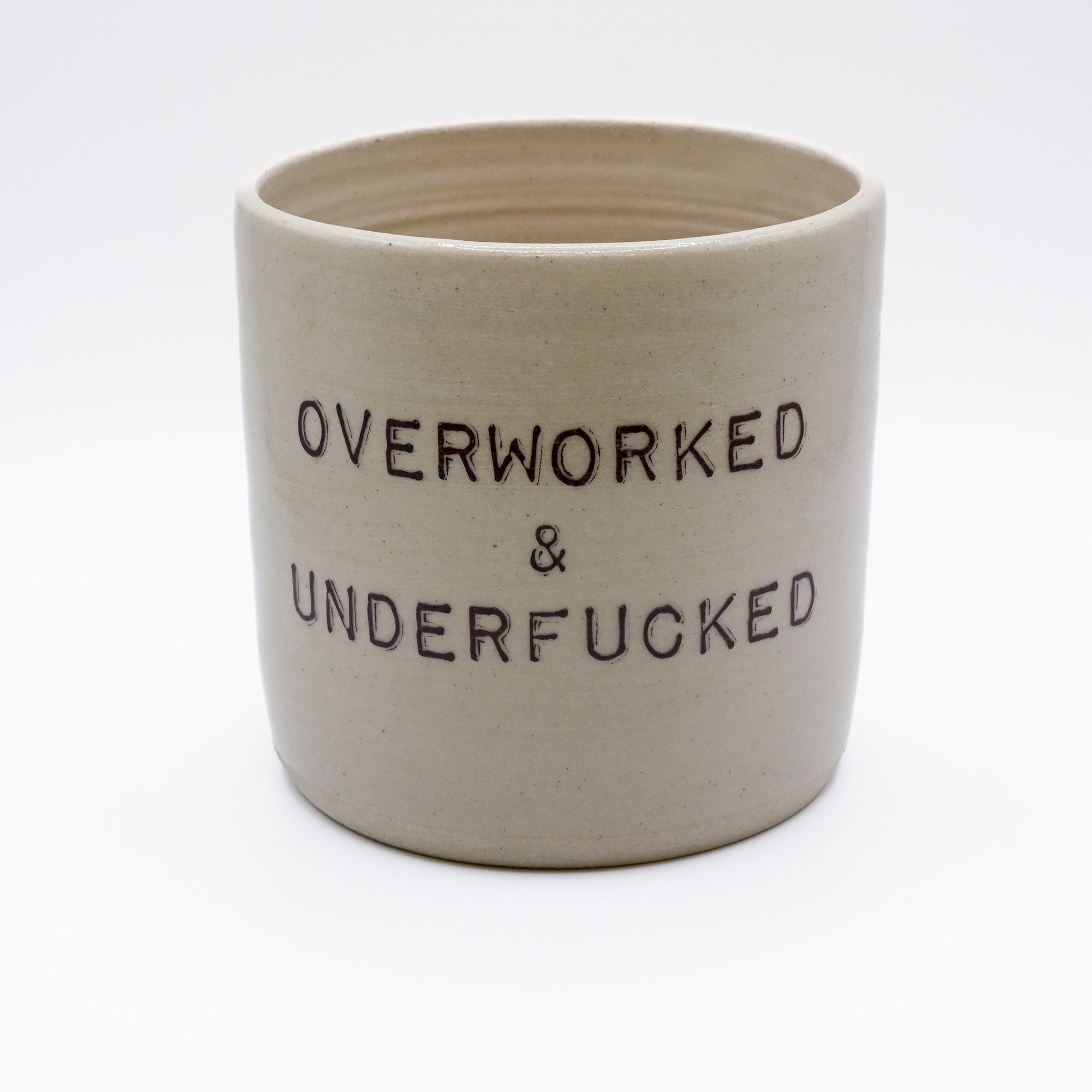 Say it like it is with the OVERWORKED & UNDERFUCKED Mug, a witty and bold addition to your kitchenware. Crafted by The Clay Lab in Malmö, this white stoneware mug features the candid text "OVERWORKED & UNDERFUCKED" hand-printed on each piece. Perfect for those who appreciate a bit of humor and honesty with their coffee, especially during those long office hours.