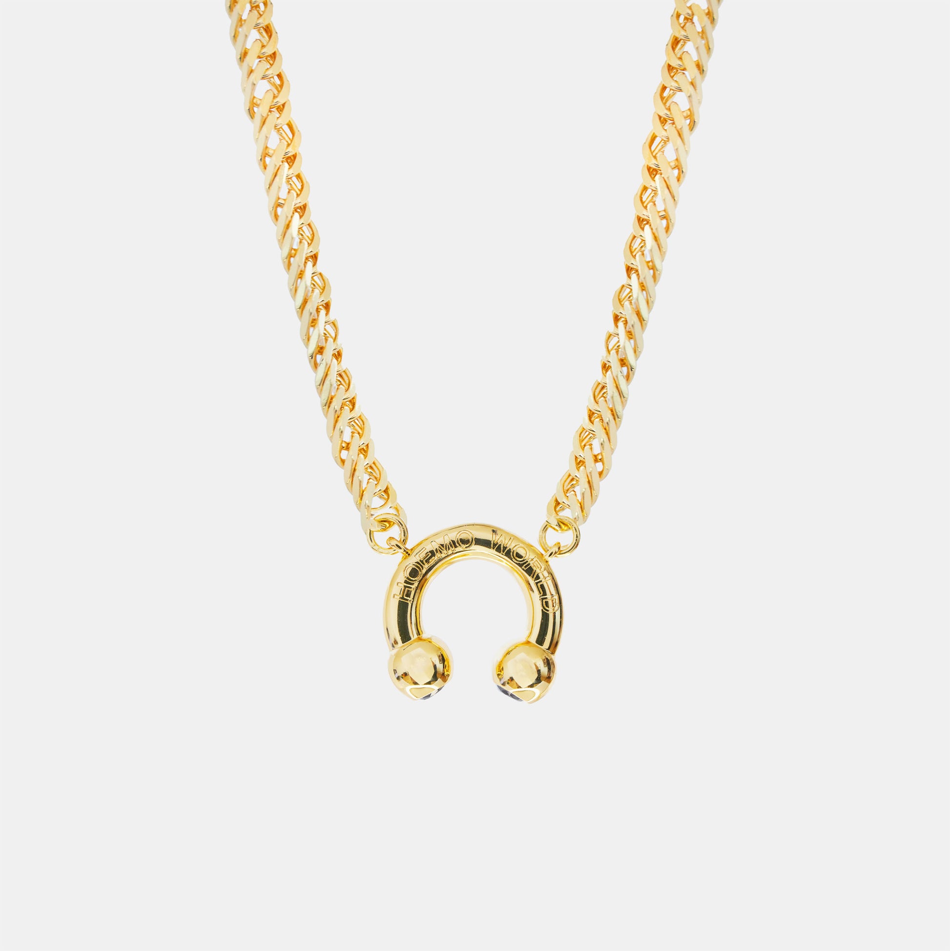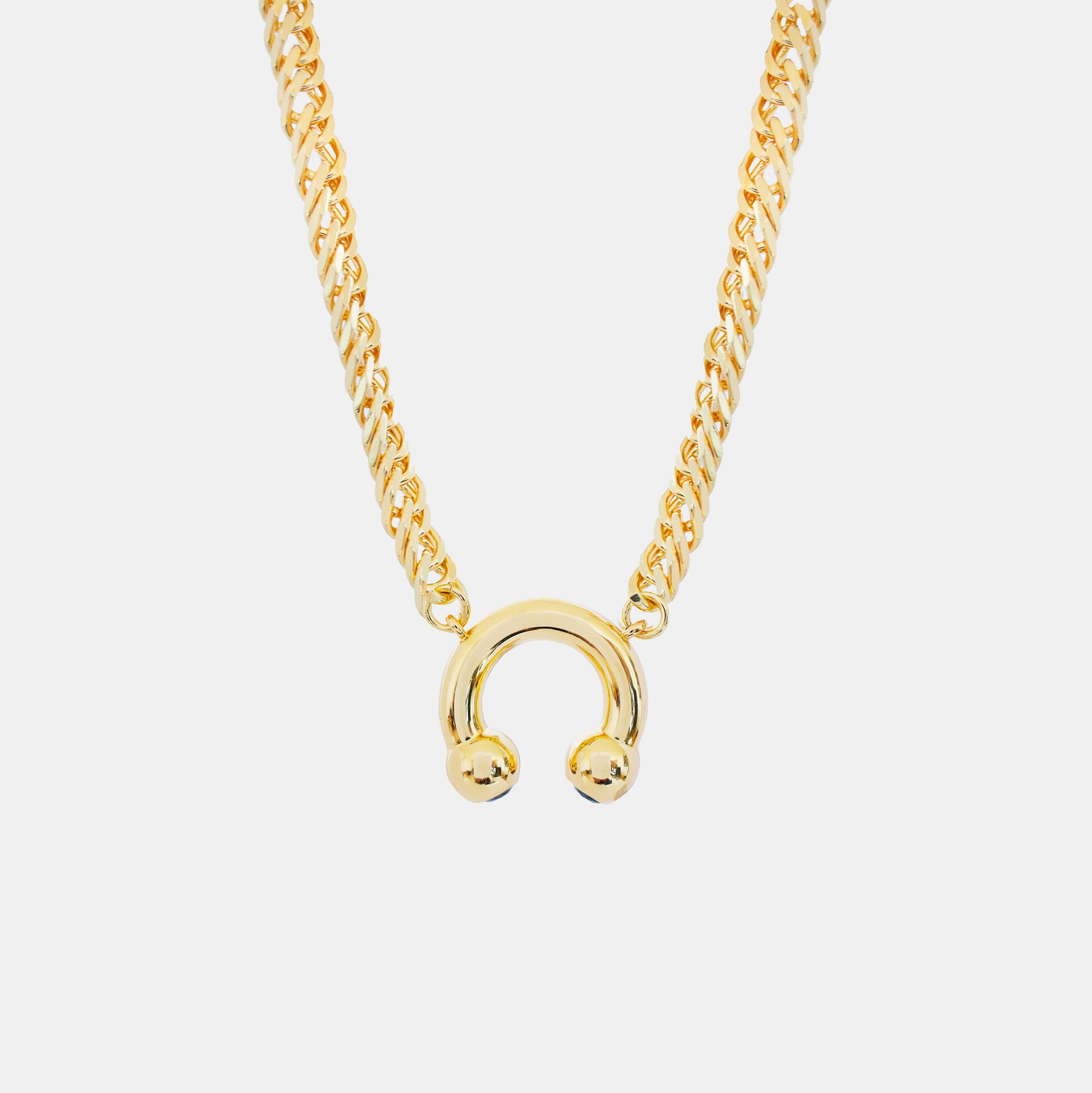 Hoemo World redefines edgy elegance with the Prince Albert Chunky Pendant Necklace in luxe gold. Featuring a circular barbell design tipped with sparkling Cubic Zirconia stones, this oversized pendant is plated in real 18K gold and engraved with Hoemo World branding on the reverse. Paired with a bold, chunky chain, this statement piece delivers an iconic IYKYK nod to queer culture while maintaining a refined, premium aesthetic.