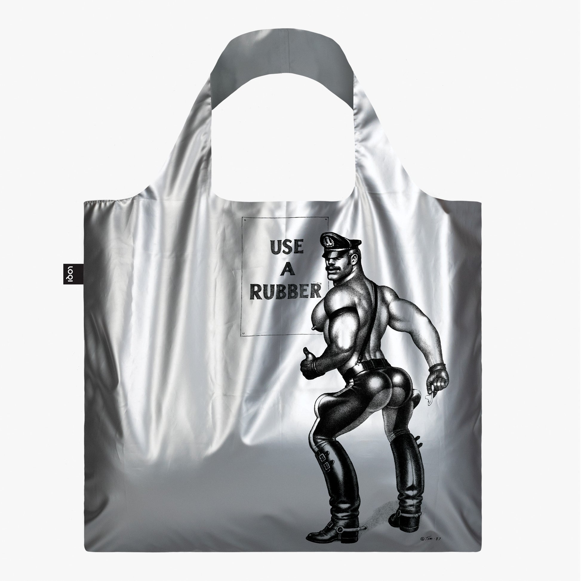 Carry a piece of art history with you with the Tom of Finland Tote Bag - Use a Rubber, Silver Metallic. Featuring the iconic "Use a Rubber" artwork from 1987, this metallic silver tote bag is both stylish and practical. Tom of Finland's influence on art and culture is profound, and this bag showcases his signature style with pride.